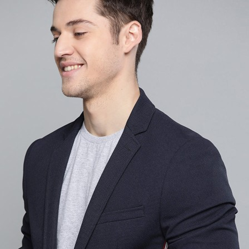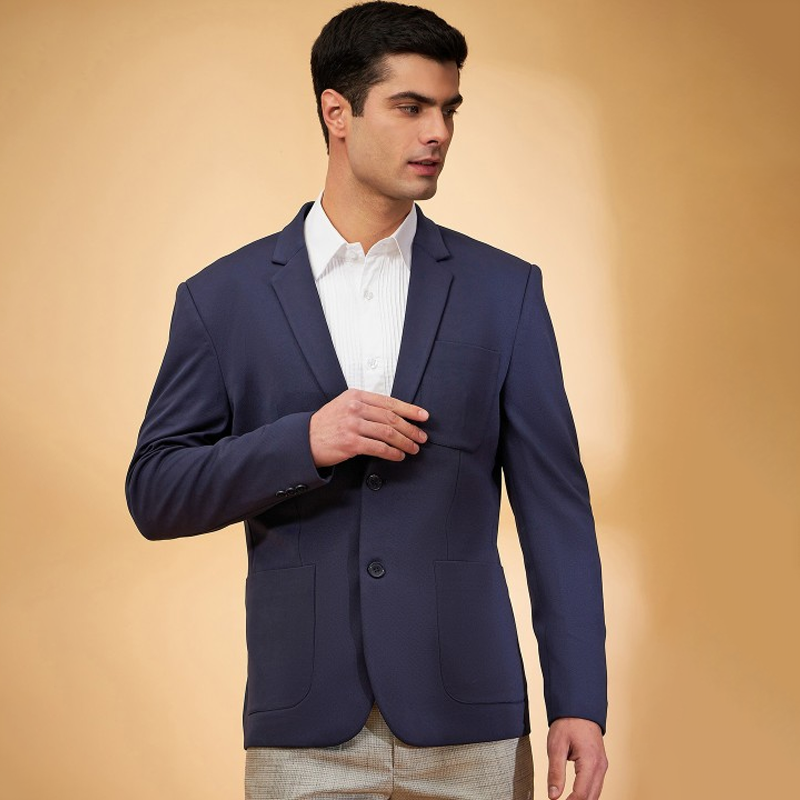 Men Navy Blue Solid Single-Breasted Regular Fit Casual Blazer