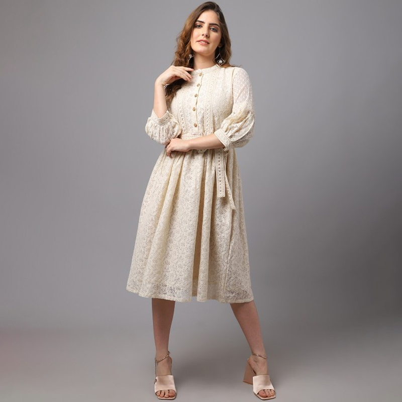 Geometric Print Puff Sleeve Fit & Flare Midi Dress
